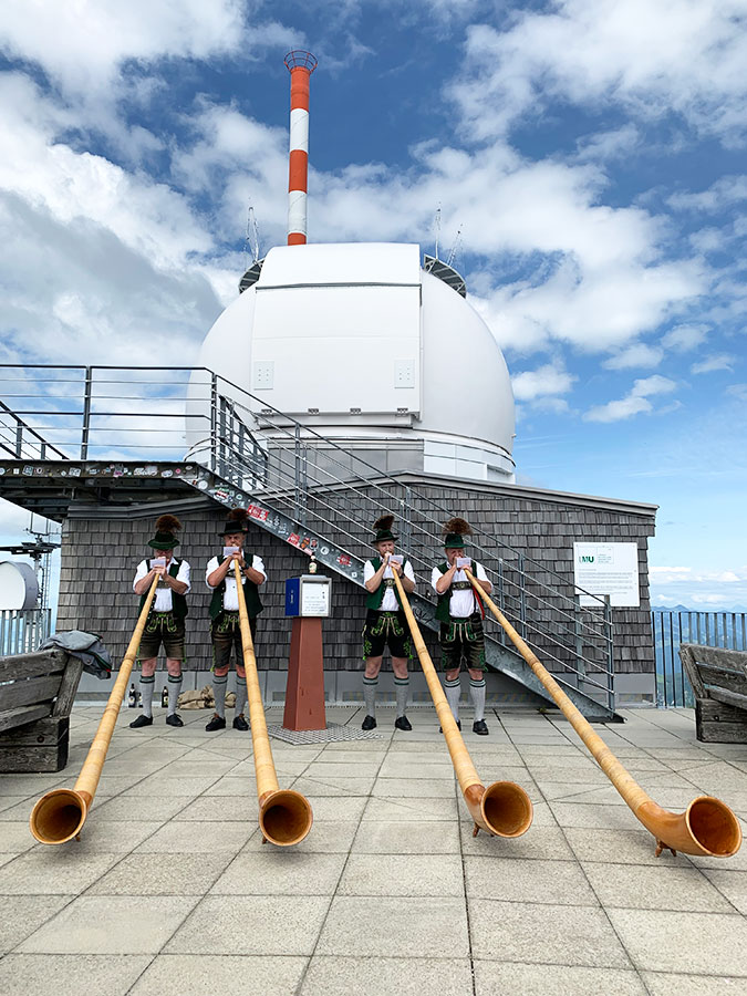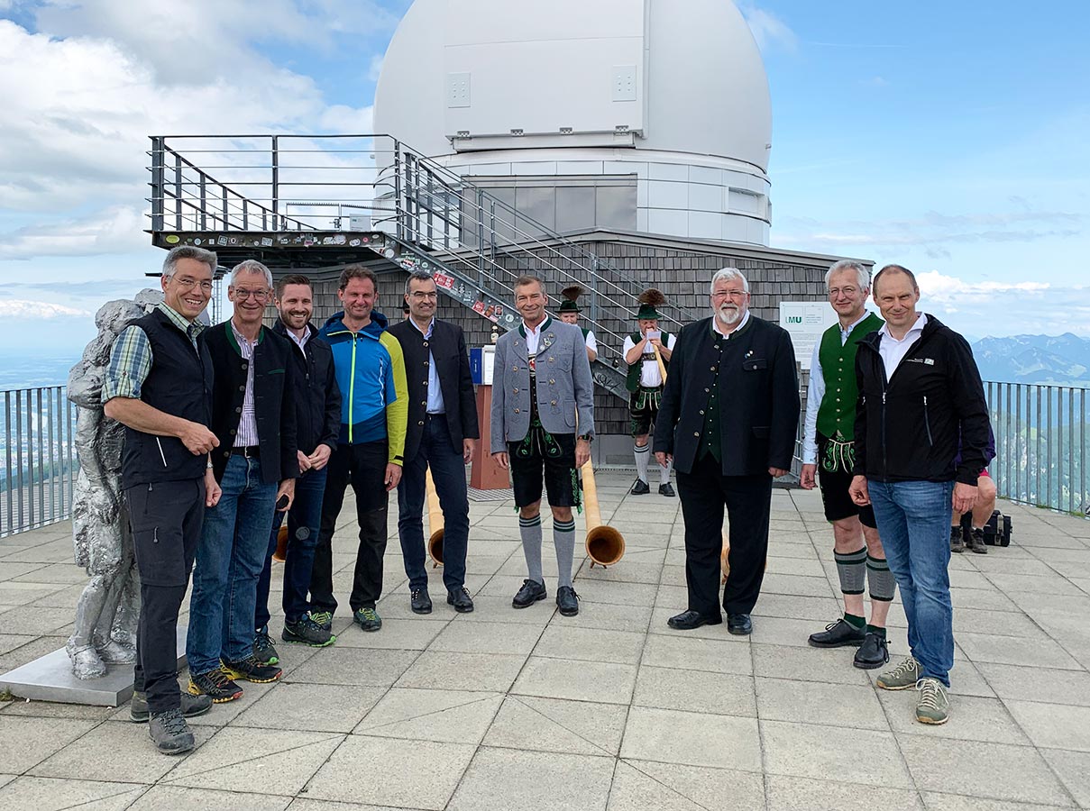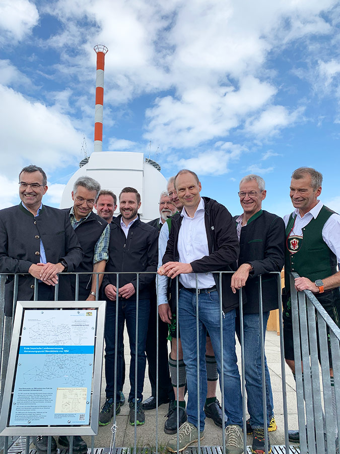 Auf dem Gipfel des Wendelsteins befindet sich einer der letzten markierten Vermessungspunkte aus der Zeit der ersten bayerischen Landesvermessung. Ab sofort macht eine neue Infotafel auf dessen Bedeutung aufmerksam. Der Präsident des Landesamts für Digitalisierung, Breitband und Vermessung (LDBV), Daniel Kleffel, und der Geschäftsführer der Wendelsteinbahn GmbH, Florian Vogt, präsentierten die Infotafel im Rahmen eines gemeinsamen Pressetermins am 6. Juni 2025.