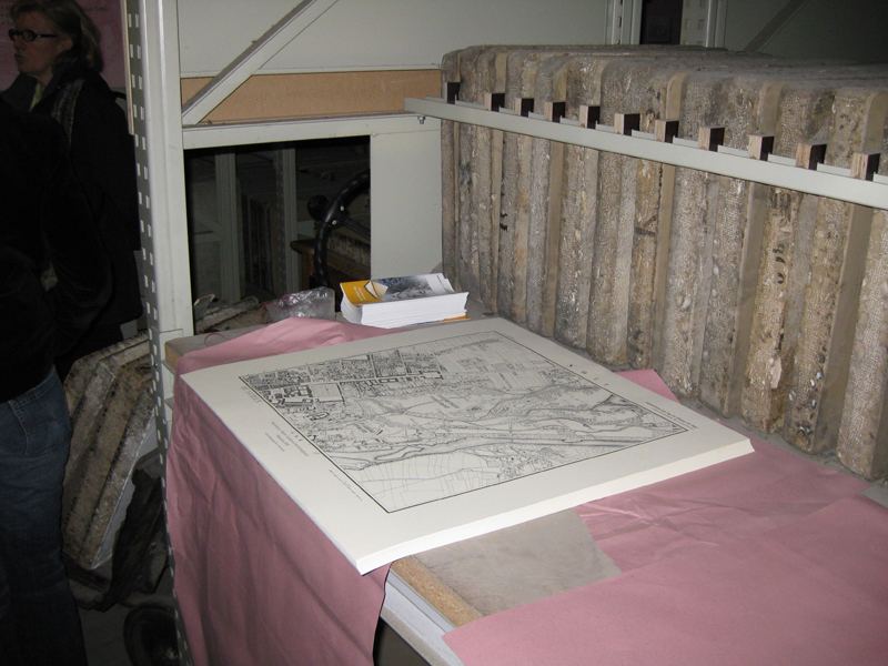 Die Ergebnisse der ersten flächendeckenden Grundstücksvermessung in Bayern wurden ab Beginn des 19. Jahrhunderts in diese Kalksteinplatten graviert. Die Lithographiesteine dienten ab Beginn der amtlichen bayerischen Vermessung und bis weit in das 20. Jahrhundert hinein zur Vervielfältigung und Fortführung von Plänen und Karten. Der Vervielfältigung lag das 1798 von Aloys Senefelder (1771-1834) erfundene Steindruckverfahren zugrunde. Senefelder beschrieb die Steinplatten spiegelverkehrt mit Fettkreide und ätzte sie mit "Gummiwasser", einer Lösung aus Gummiarabicum und Eisenvitriol. Nur die mit der Kreide gezeichneten Stellen nehmen beim Einfärben die Druckfarbe an.