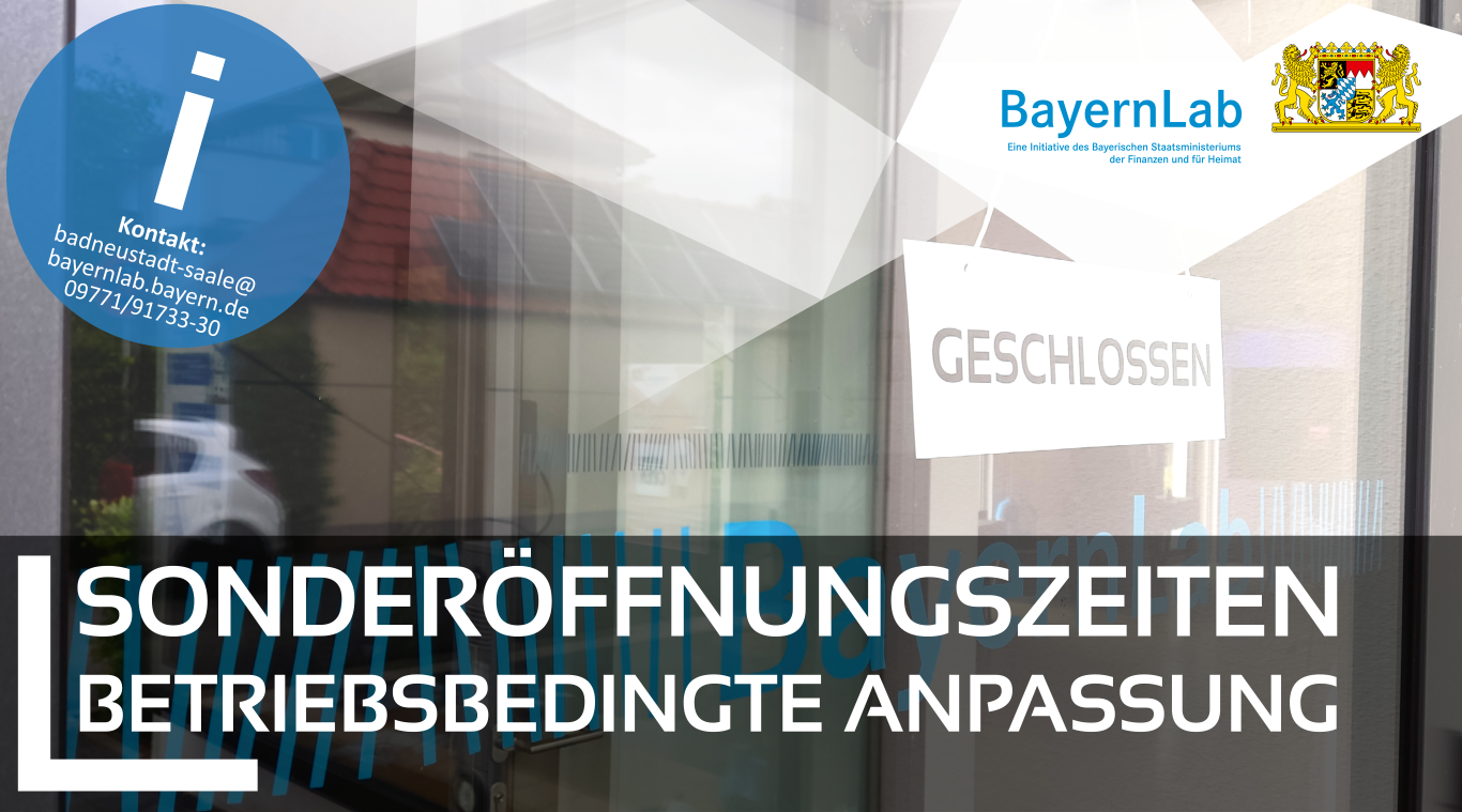 Grafik für Sonderöffnungszeiten im BayernLab Bad Neustadt. Im Hintergrund ist das Schaufenster des BayernLabs zu sehen in dem ein Schild
